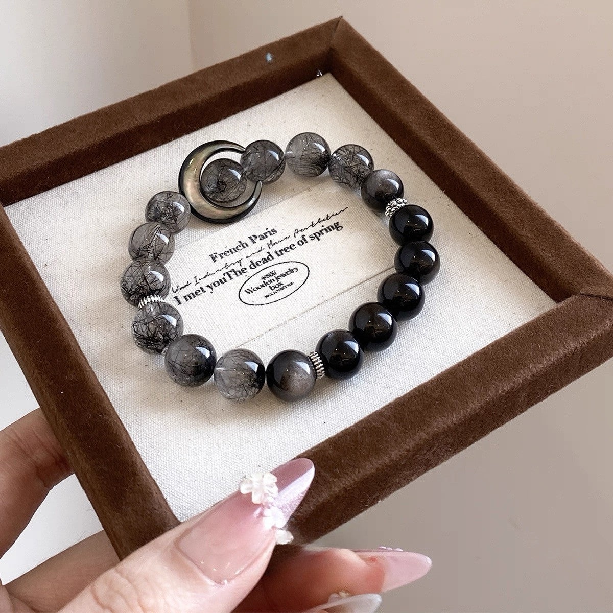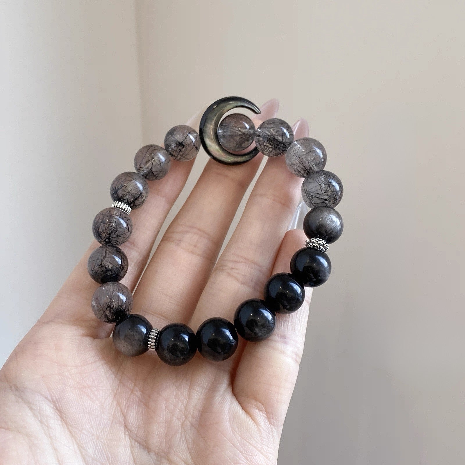 Natural Black Rutilated Quartz, veined with earth’s golden filaments, attracts abundance and determination. Pure Silver Sheen Obsidian, like a guardian’s eye forged in darkness, wards off negativity and steadies the mind. United under a crescent moon clasp, it becomes a profound talisman for your wrist.